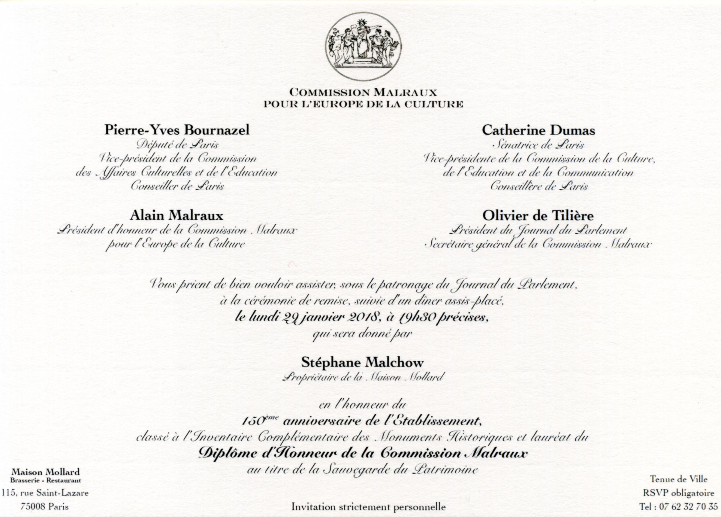 Remise au titre du patrimoine à la brasserie Mollard avec, notamment, le Président Alain Malraux, le député Oliver Dassault et la Sénatrice Catherine Dumas.